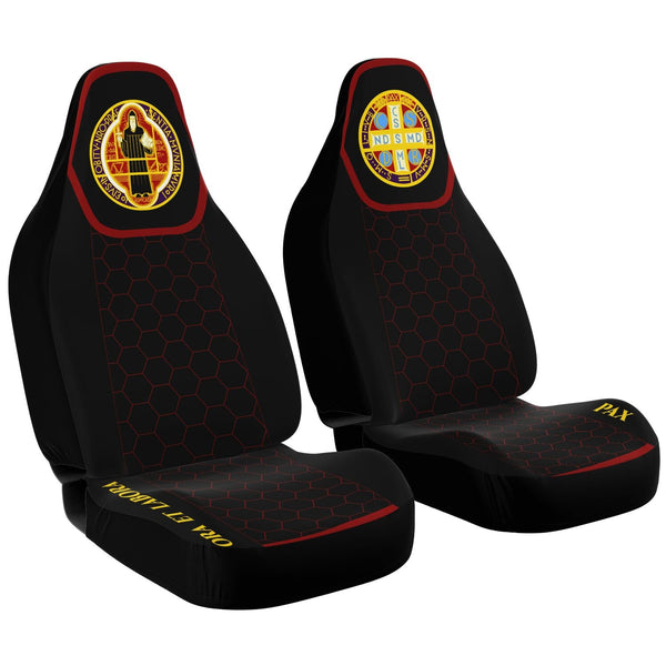 The two sides of the Saint Benedict Medal, on a field of black and red (the traditional colors of the Benedictine Order). The passenger car seat has the motto "Ora et Labora" (Work and Prayer), while the driver side car seat has "Pax" (a traditional Benedictine greeting).