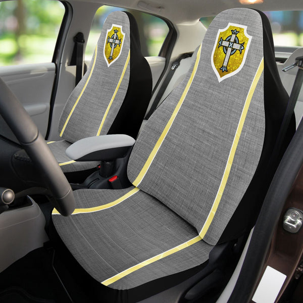 Spread the faith and elevate your car's look with a stunning grey flared cross car seat cover, featuring all-over grey, yellow, and white printing inspired by a stained glass window in Augusta, Georgia.